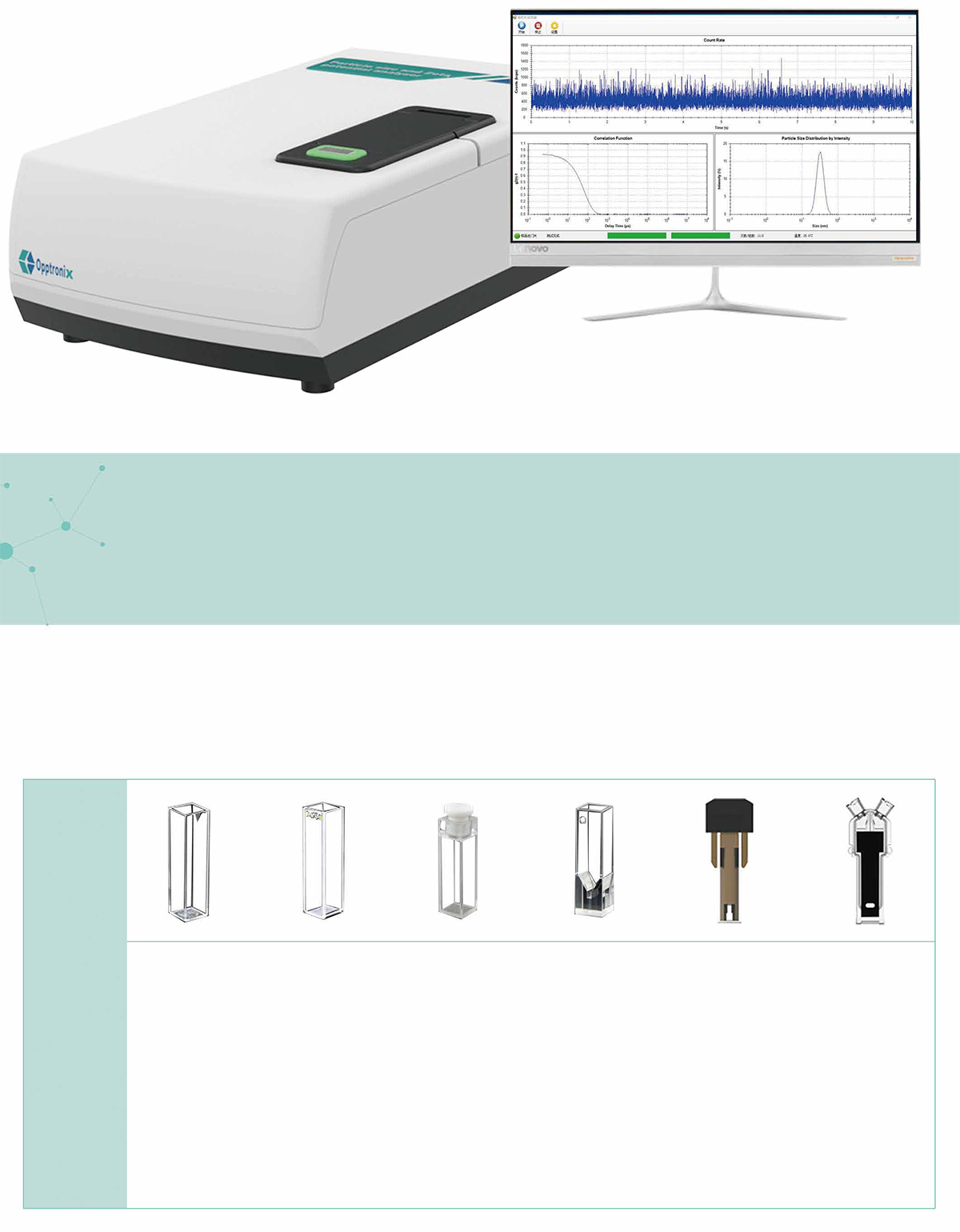 基于動(dòng)態(tài)光散射和多普勒電泳光散射原理的納米粒度及Zeta電位分析系統(tǒng)主機(jī),粒徑范圍0.3nm至15μm,Zeta電位范圍-600mV至+600mV,該系統(tǒng)集成全新的光路設(shè)計(jì)及光纖技術(shù),采用50毫瓦固體激光器,激光能量輸出依樣品不同而自動(dòng)調(diào)節(jié),兼顧極高的靈敏度和信噪比,溫控范圍0℃至90℃,控溫精度達(dá)±0.1℃。采用高速數(shù)字相關(guān)器,最小采樣時(shí)間可達(dá)25ns,動(dòng)態(tài)范圍高達(dá)1011。